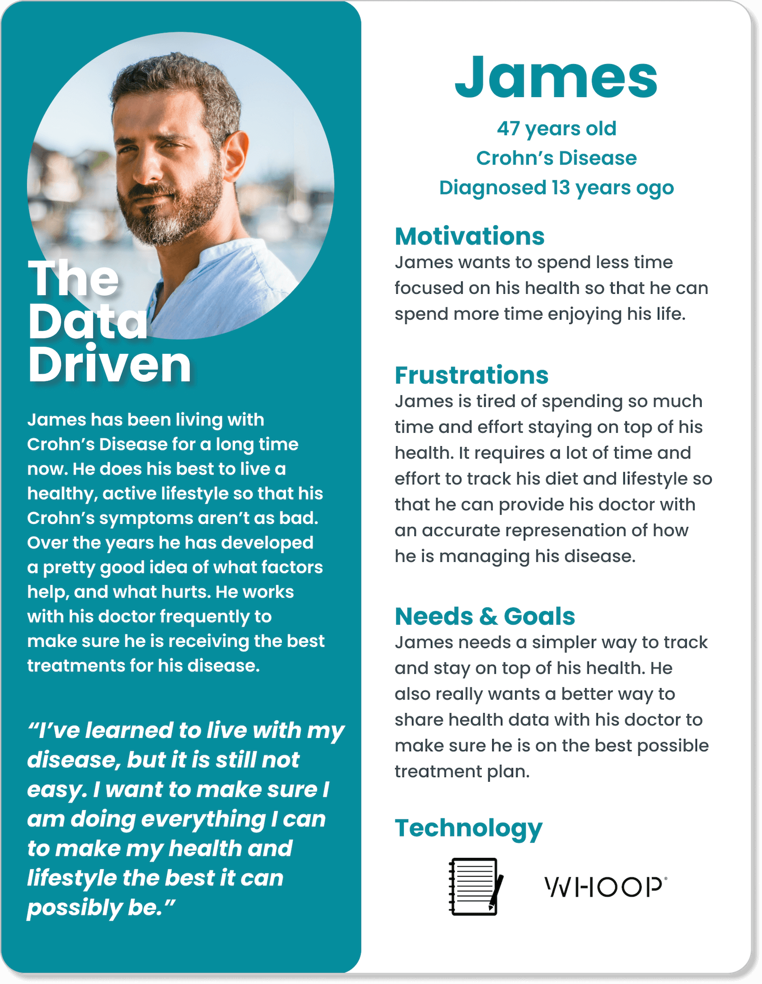 “As a data-driven patient, I want a way to be able to track my diet, symptoms, and lifestyle so that I can share data with my doctor and make sure I am living the healthiest lifestyle for my GI disease.”