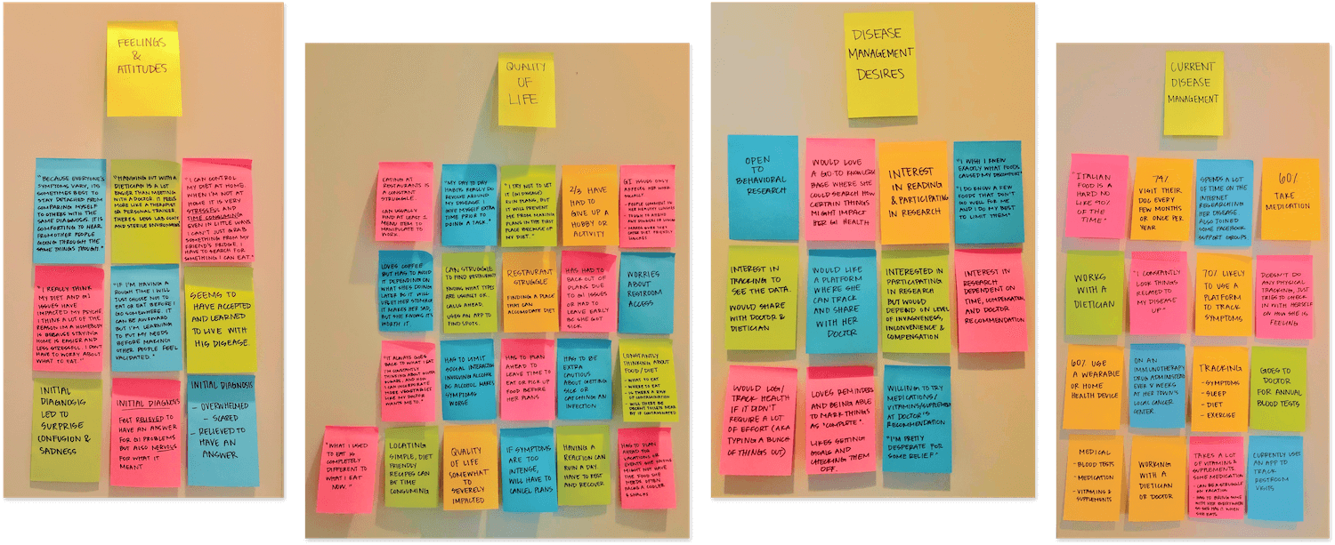 Interviews were conducted with three target users to discuss their attitudes surrounding their GI diseases and how it has impacted their quality of life. Results were affinity mapped and assigned to clusters.