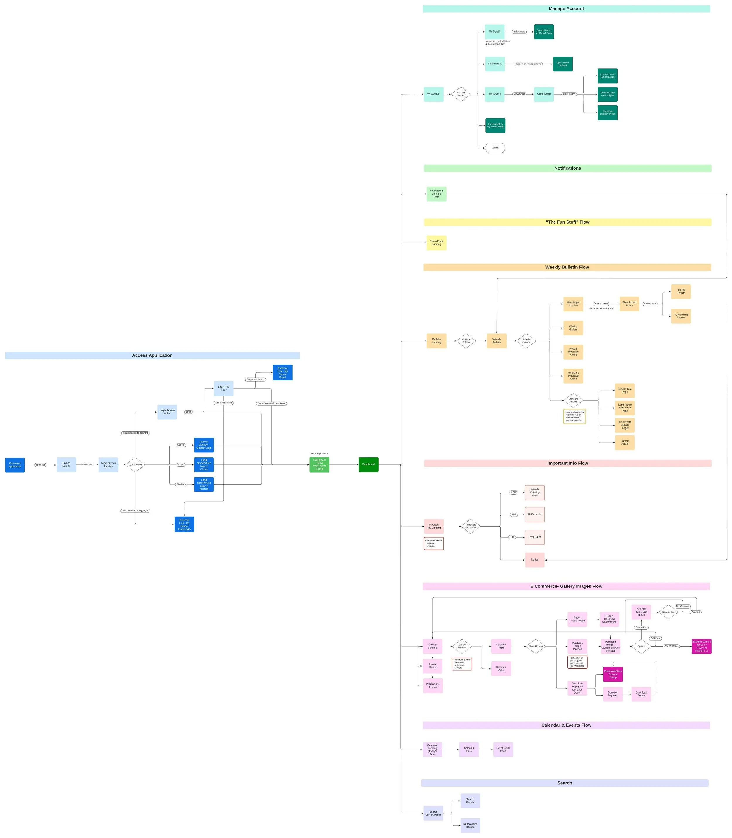 With these solutions in mind, we began mapping out our user journeys. While our initial focus was on parents and staff, the client later informed us that they would also like to provide “VIPs” (such as school benefactors) and older students access to the application. While this didn't significantly alter the application's overall functionality, it did add complexity to defining user journeys and information architecture.